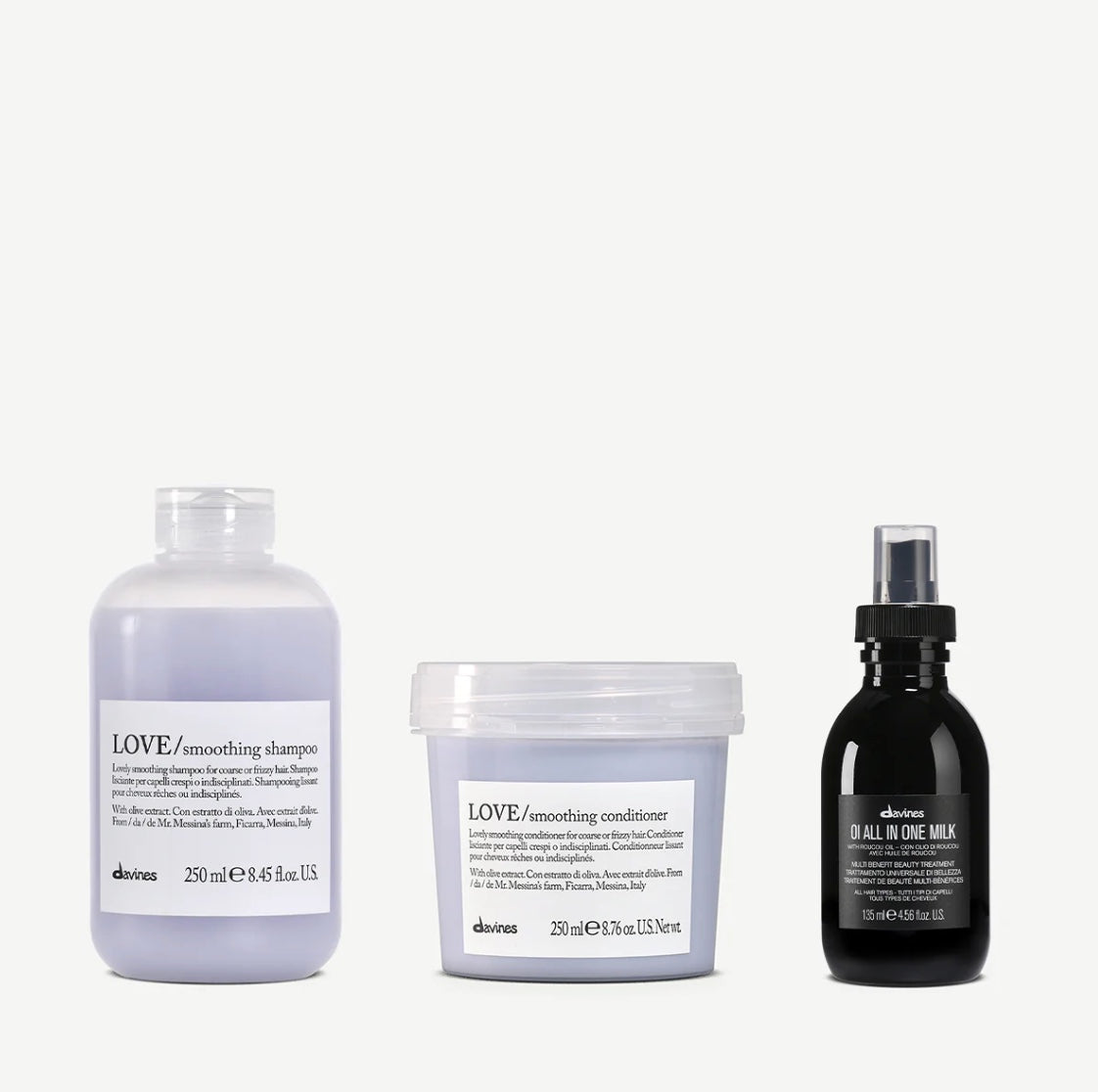 The ideal anti-frizz conditioner to control frizzy or curly hair, LOVE Smoothing Conditioner moisturizes the hair, helps restore elasticity and leaves an unmistakable shine behind. LOVE Smoothing Conditioner is best paired with our LOVE Smoothing Shampoo for a complete, natural hair conditioning experience. Formulated with Minuta olive extract, this conditioner is nourishing and softening.